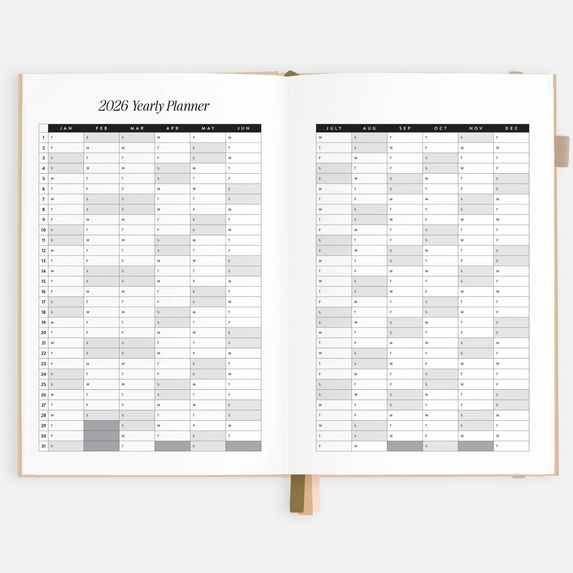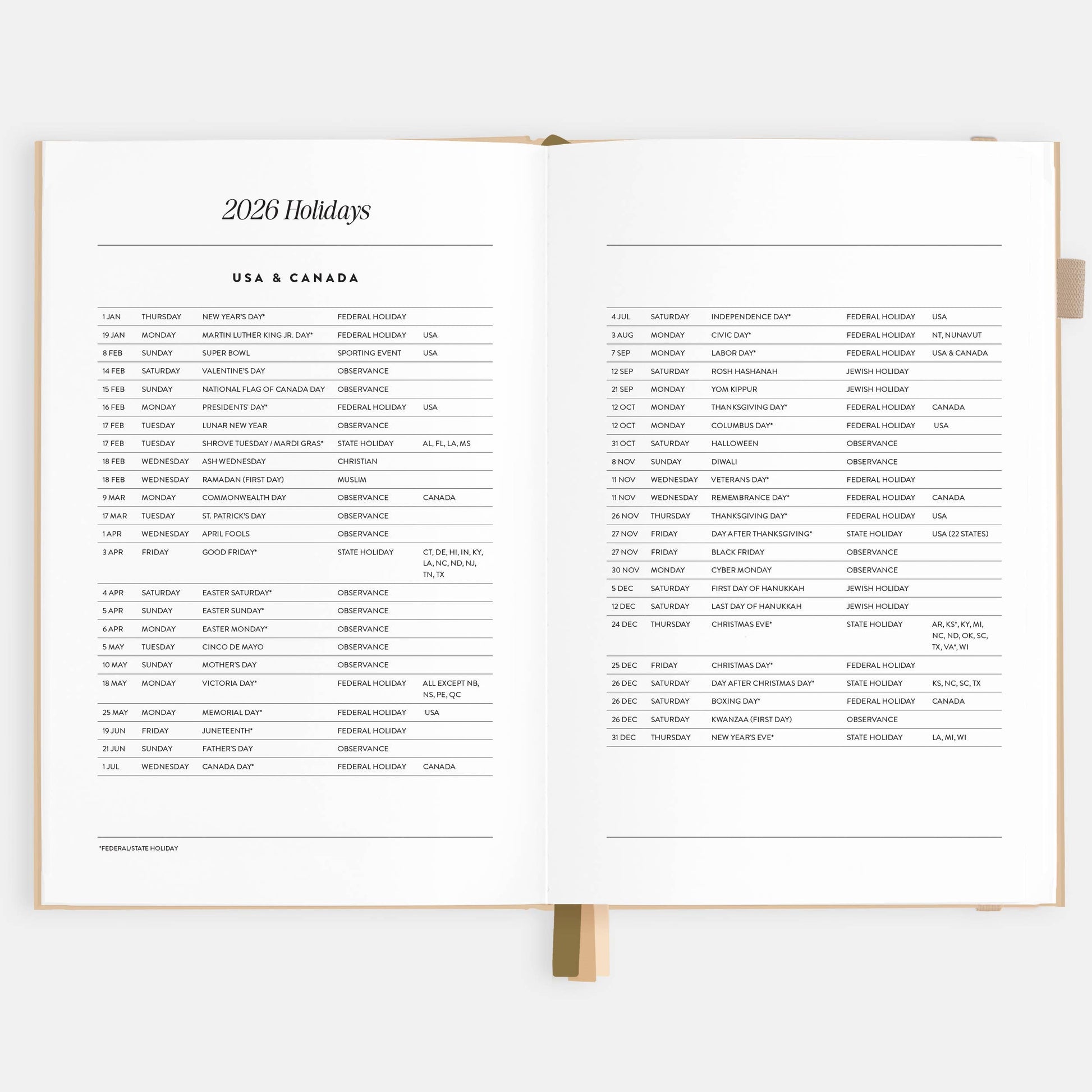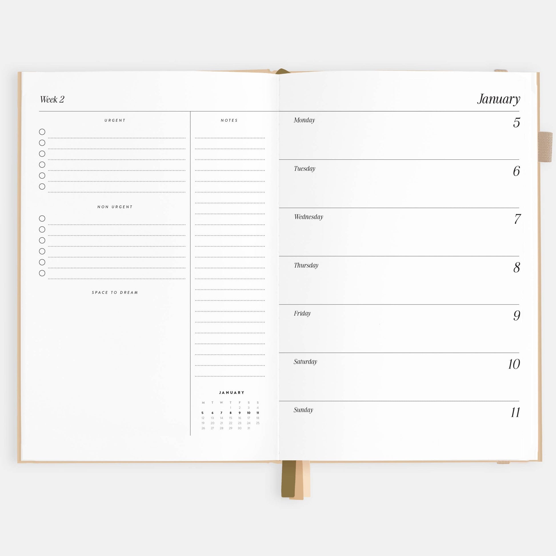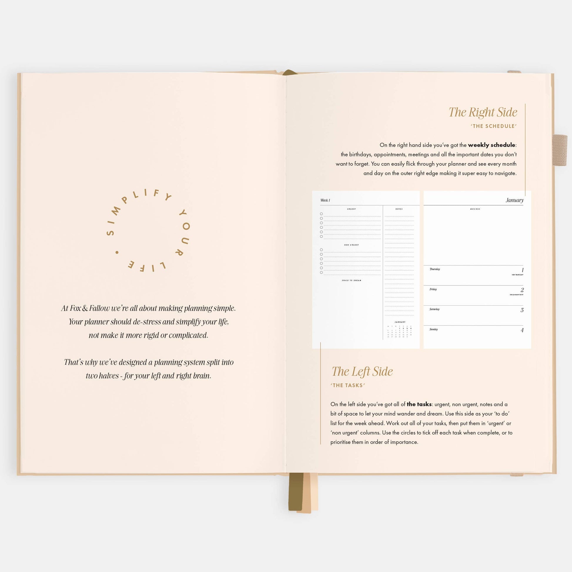 Our best-selling A5 planners are back with a brand new horizontal layout and a new planning system designed to simplify your life. At Fox & Fallow we're all about making planning simple. Your planner should de-stress and simplify your life, not make it more rigid or complicated. That's why we've designed a planning system split into two halves - for your left and right brain. Featuring a horizontal weekly layout, lay-flat binding, elastic closure and pen loop, document pocket at the back, three ribbons, gold foil edges, added blank pages. One week per spead and monthly spreads at the beginning of each section. Premium 120gsm paper. 208 pages.