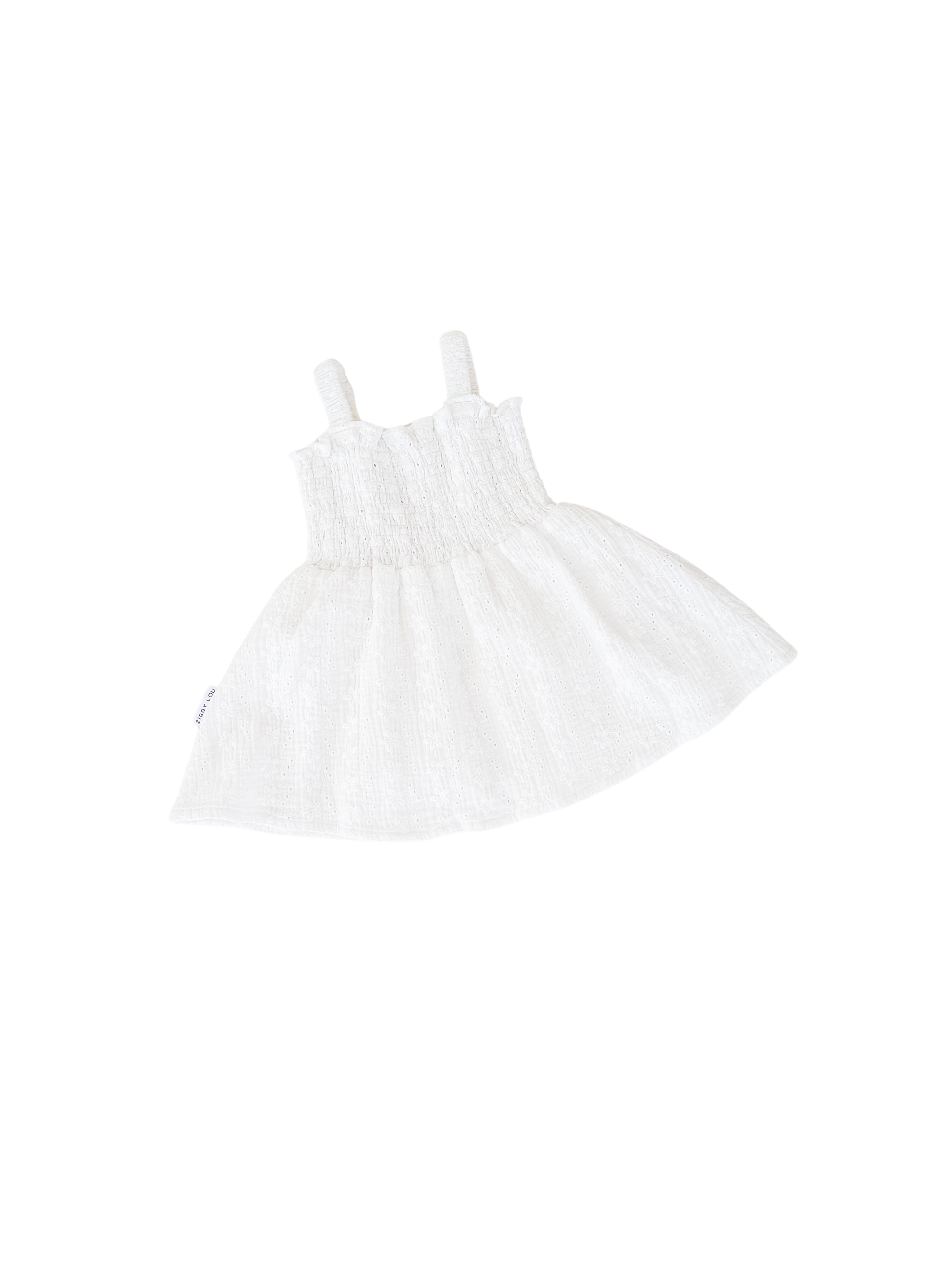 Cotton dress in our Laurel broderie anglaise fabric. Featuring a shirred bodice with adjustable buttonhole straps.