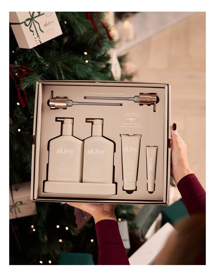 Housed in our signature interlocking bottles with a coordinating tray, this exclusive set includes a Hand Wash, Hand Lotion, Hand Cream, and Lip Butter. Interchangeable bronze pumps add a versatile accent, allowing the set to be styled seasonally or enjoyed as a timeless statement piece throughout the year.